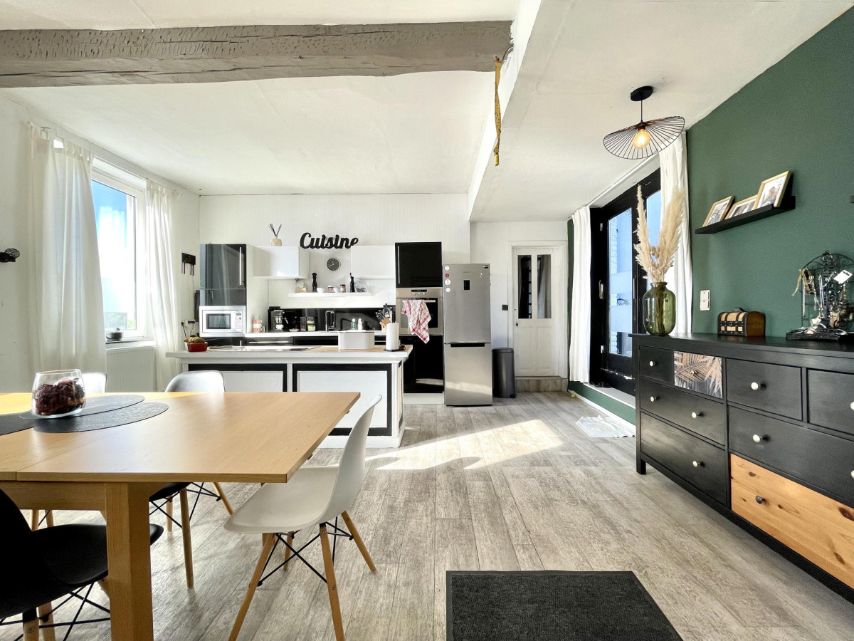 Elle se compose comme suit : AU-REZ-CHAUSSE : un hall d’entrée, un salon (27m²), une salle à manger (25m²), une cuisine (8m²) et un WC indépendant. AU PREMIER ETAGE : Une chambre (18m²) et une salle de bain (7m²). AU DEUXIEME ETAGE : une chambre (12m²). AU TROISIEME ETAGE : un grenier aménageable (23m²). la maison bénéficie également d’une cave, d’une terrasse et d’un jardin orienté plein-sud. TECHNIQUES : Chauffage central gaz, production d’eau chaude, électricité non conforme, RC 503€.
